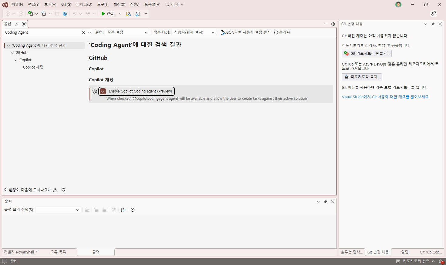 기본적으로 Visual Studio 2026은 Copilot Agent와 독립적으로 실행됩니다. 그러나 Github 리포지터리를 사용하는 경우, 위와 같이 프리뷰 기능을 켠 후 원격으로 에이전트가 작업을 시작하도록 지시할 수 있습니다. (단, 이 기능은 해당 프로젝트가 Github에 리포지터리로 버전 관리 중인 상태여야 합니다.)
