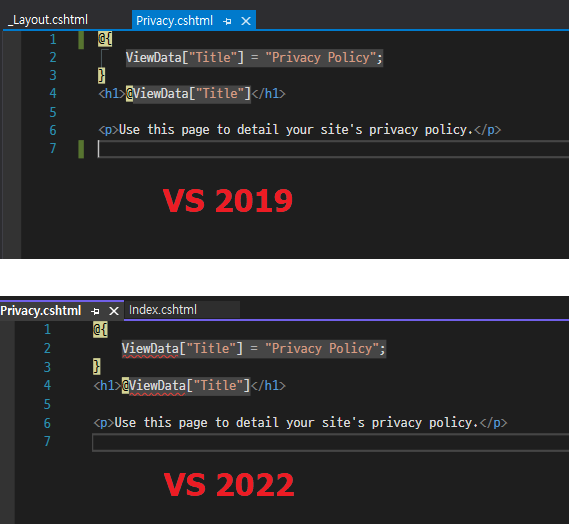 위 이미지는 동일한 소스코드를 2019와 2022에서 보는 화면인데요.