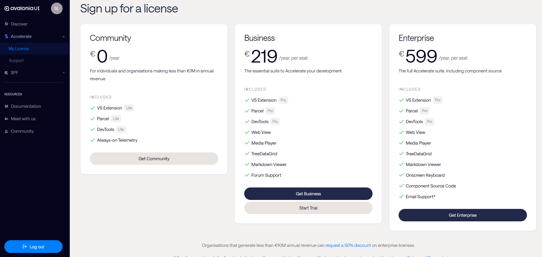 미래에 어떻게 바뀔지는 사실 알 수 없지만, 일단 지금 상황으로 보면 Visual Studio Community 버전과는 달리 Avalonia Accelerate는 무료 사용에 단서 (매출 규모, 개발팀 인원수)를 아직은 매기지 않은 것 같습니다.