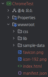 프로젝트의 wwwroot 폴더에 다음과 같은 내용의 manifest.json 파일을 만들어 줍니다. (아까와는 내용이 다릅니다.)