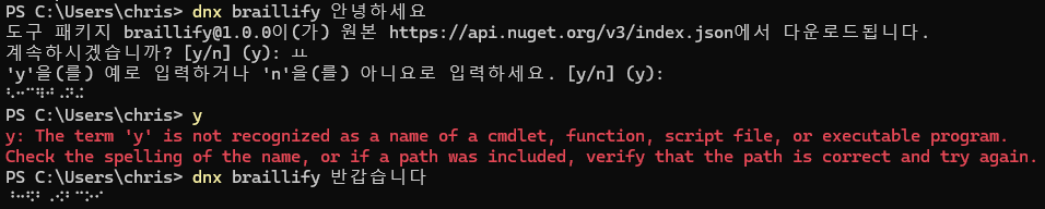 Nuget에서 라이브러리 참조해서 사용하실 때는 BraillifyNet 을 사용하시고, dotnet tool로 사용하실 때는 Braillify 를 사용하시면 됩니다. .NET 10이 설치되어 있다면 dnx 명령어로 사용 가능합니다. 전 첫 실행하다가 오타가 났네요.