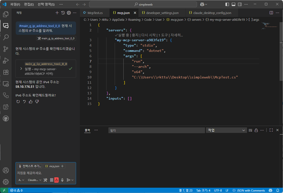 그리고 다음과 같이 MCP 서버 설정 JSON을 추가하여 연동할 수 있습니다.