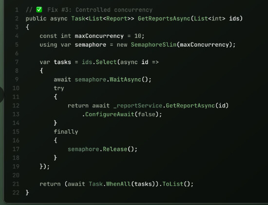 @al6uiz 님 말씀 처럼 UI가 없는 서버 환경에서 ConfigureAwait(false)는 성능 향상을 기대할 수 없다고 봐야 될 것 같습니다. Semaphore를 사용하는 솔루션은 왜 넣었는지 모를만큼 잘 이해가 안가네요??