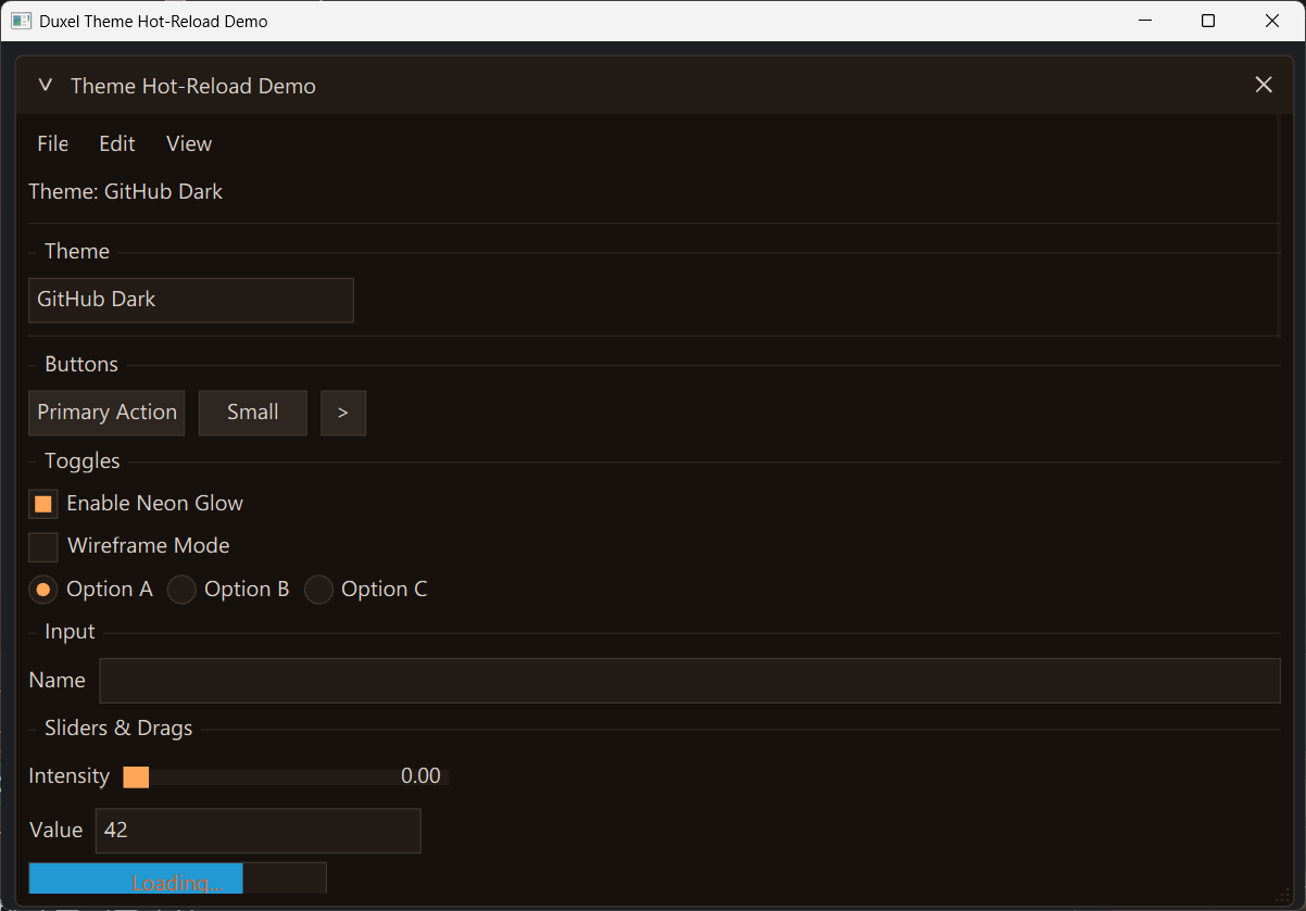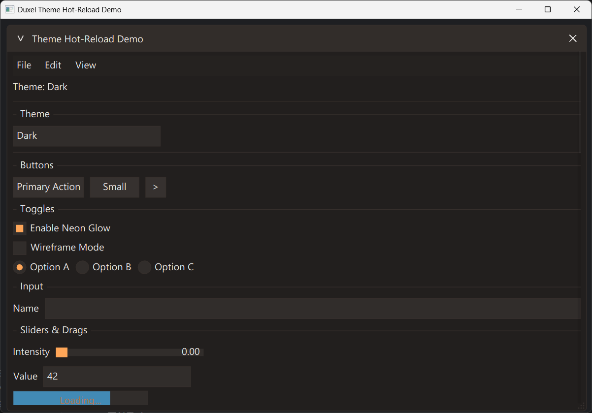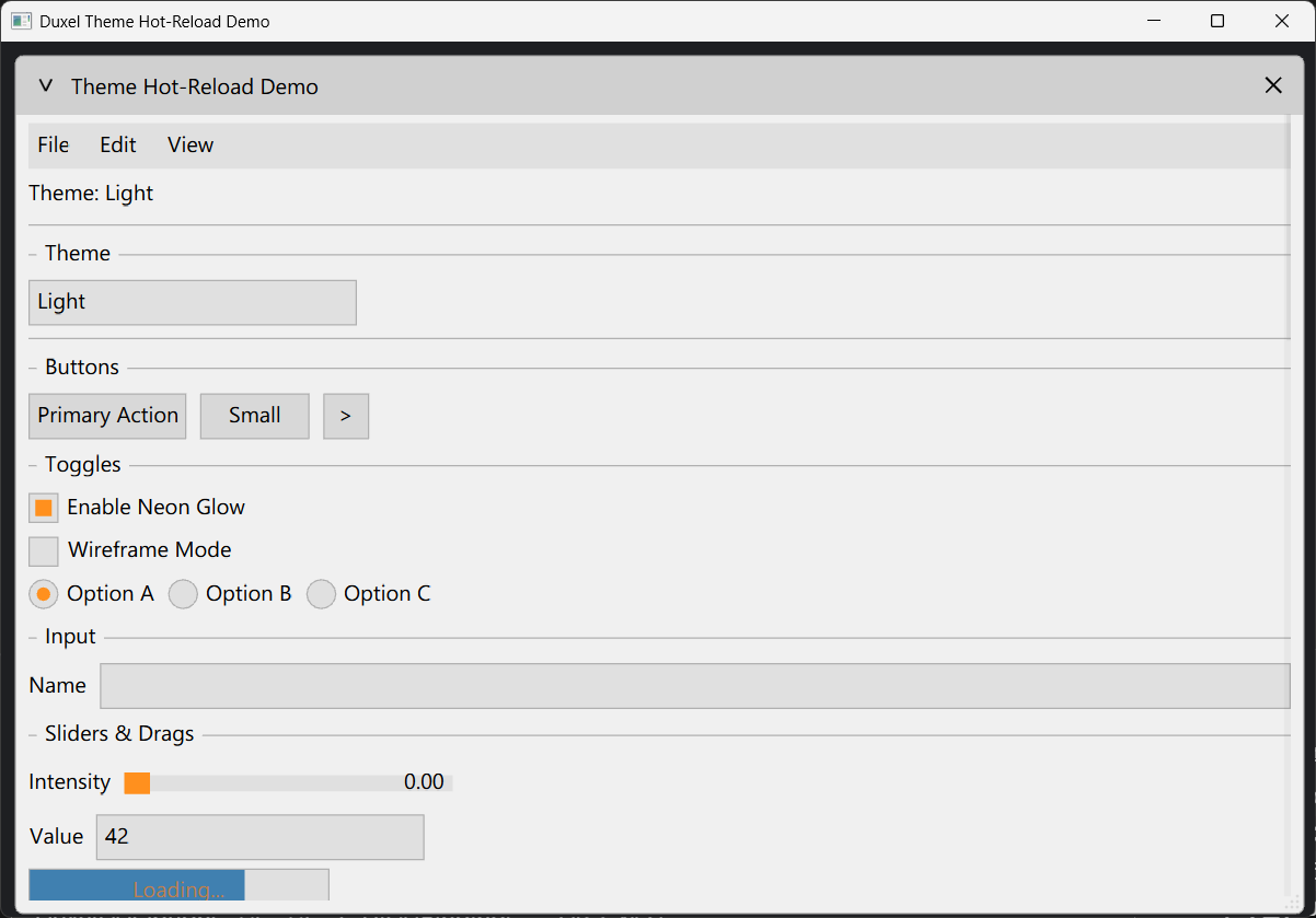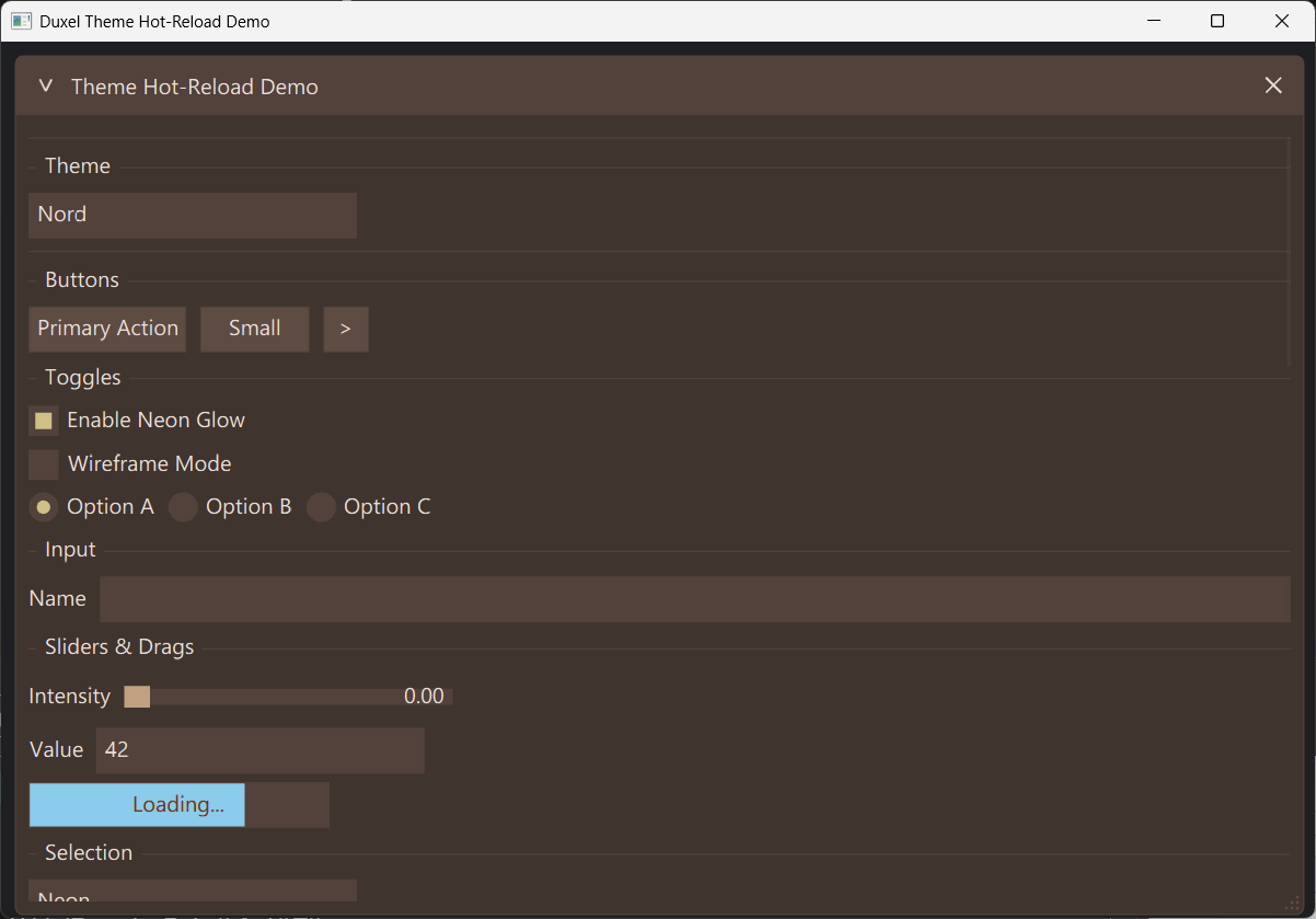[기능] ThemeDemo 샘플 — DSL 기반 테마 핫리로드 데모 앱, 테마 선택 Combo, 제어 흐름 데모, NativeAOT 지원.