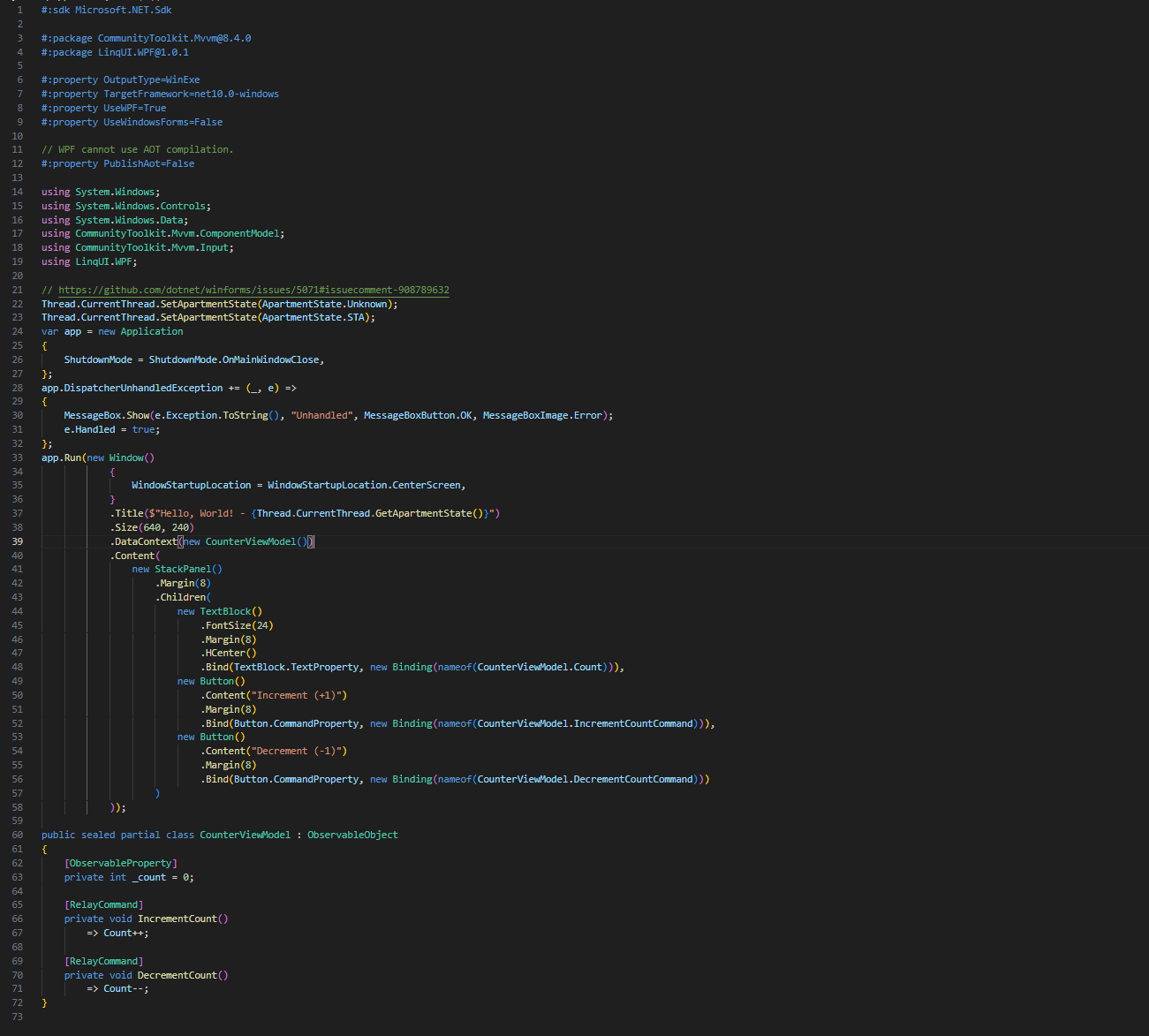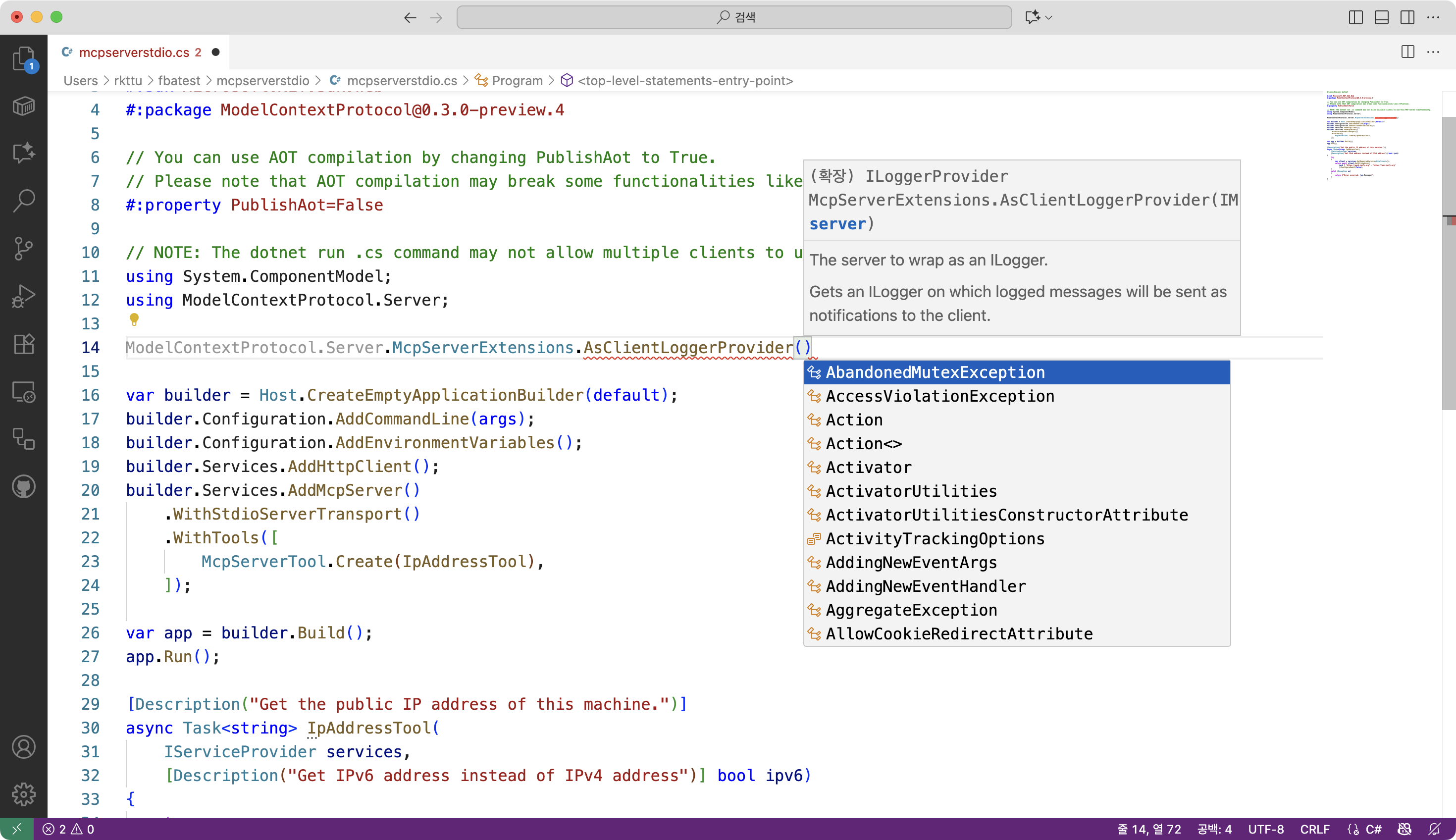 이렇게 만든 FBA 코드를 C# Extension을 설치한 뒤 VS Code에서 열면, Visual Studio 라이선스가 요구되는 C# Dev Kit Extension 없이 무료로 nuget 패키지까지 인식 가능한 인텔리센스 기능까지 활성화하여 아래 그림처럼 쓸 수 있게 됩니다. (Win32 전용 템플릿을 제외하면, 당연히 아래 기능은 Linux, macOS에서도 잘 지원됩니다.)