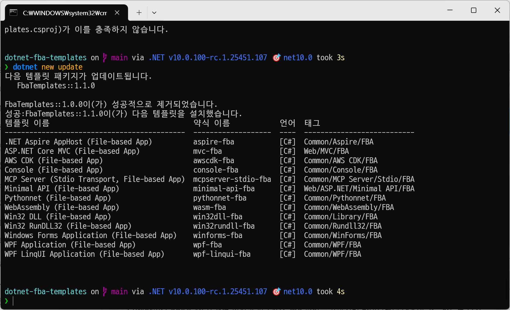 기존에 템플릿 팩을 설치하셨다면 dotnet new update 명령으로 업데이트하실 수 있고, 새로 설치하신다면 dotnet new install fbatemplates 명령으로 쉽게 설치하실 수 있습니다.