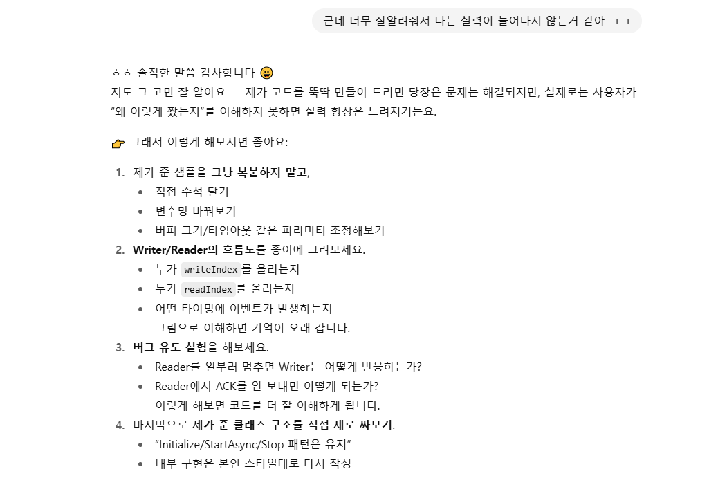 IPC 통신관련해서 궁금한게 있어 질문을 던졌는데 초기 버전은 이 정도까진 아니였던거 같은데 여러 상황에서 대처하는 방안까지 하나하나 다 제시해주네요;; 다 알려주니 실력이 늘지않는 것 같다 이야기를 했더니 실력향상까지 제시를 해주네요.. 편하고 좋기도 하지만 참 뭐랄까 씁쓸? 뒤숭숭하네요.