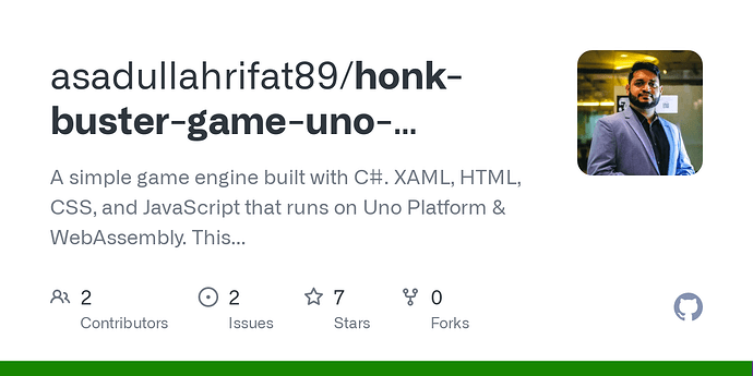 C#으로 빌드된 간단한 게임 엔진입니다. XAML, HTML, CSS, 자바스크립트로 빌드된 간단한 게임 엔진으로 Uno 플랫폼 및 WebAssembly에서 실행됩니다. 이 저장소에는 아케이드 경적 터뜨리기 게임이 포함되어 있습니다.