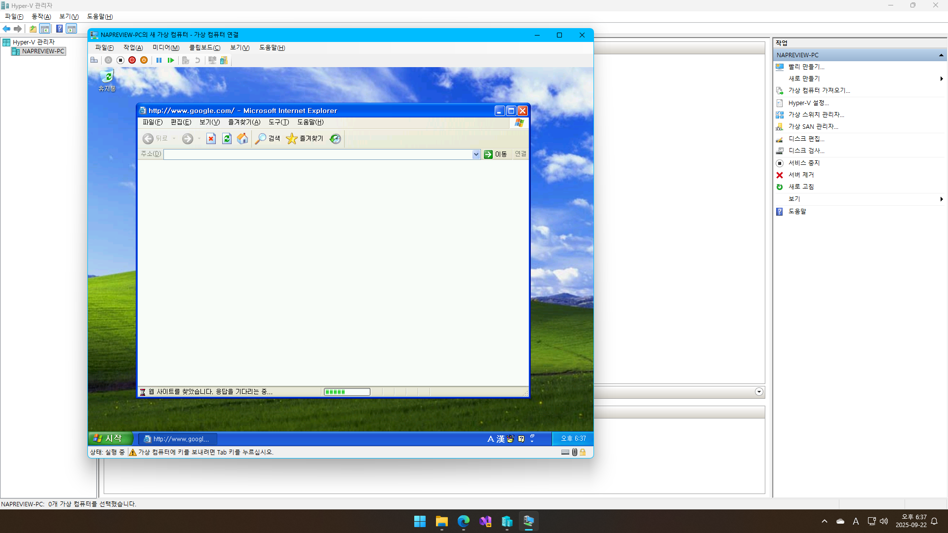 Home 버전만 사용하다보니 Hyper-V에 OS를 설치해본 적은 없는데요, VMware에서도 Windows XP는 참을 수 없을 정도로 느리게 동작합니다. 아무래도 최신 하드웨어를 인식하지 못해서 인 듯 싶기도 합니다. DosBox와 같이 CPU까지 에뮬레이션하는 가상환경이라야 정상동작하지 않을까 생각됩니다.