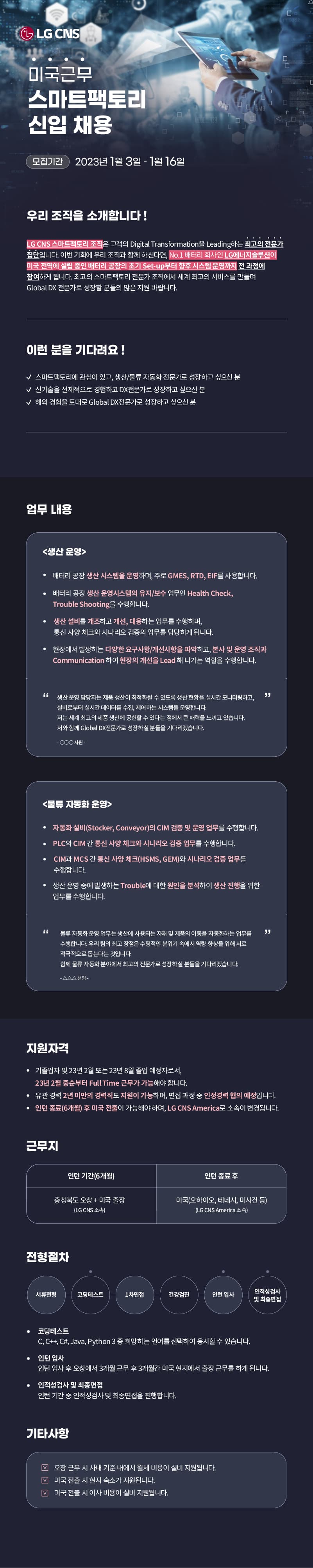 [LG CNS] "미국 근무" 2023년 스마트팩토리 신입 채용(~1/16(월) 18시)