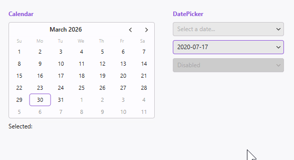 Calendar 및 DatePicker 컨트롤. 키보드/마우스 내비게이션, 월/년/10년 단위 선택 지원