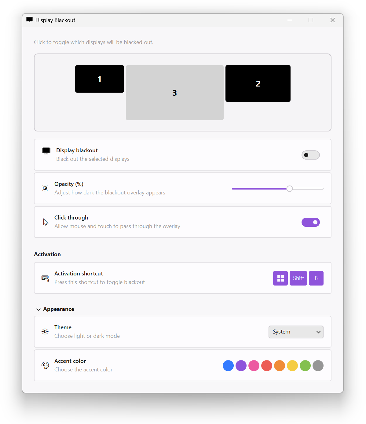필요할 때 선택한 디스플레이를 검게 가릴 수 있는 Windows 시스템 트레이 유틸리티입니다. 게임 중 주의 분산을 줄이거나, 하나의 모니터에만 집중하거나, 화상 통화 중 보조 디스플레이를 어둡게 하는 용도에 유용합니다.