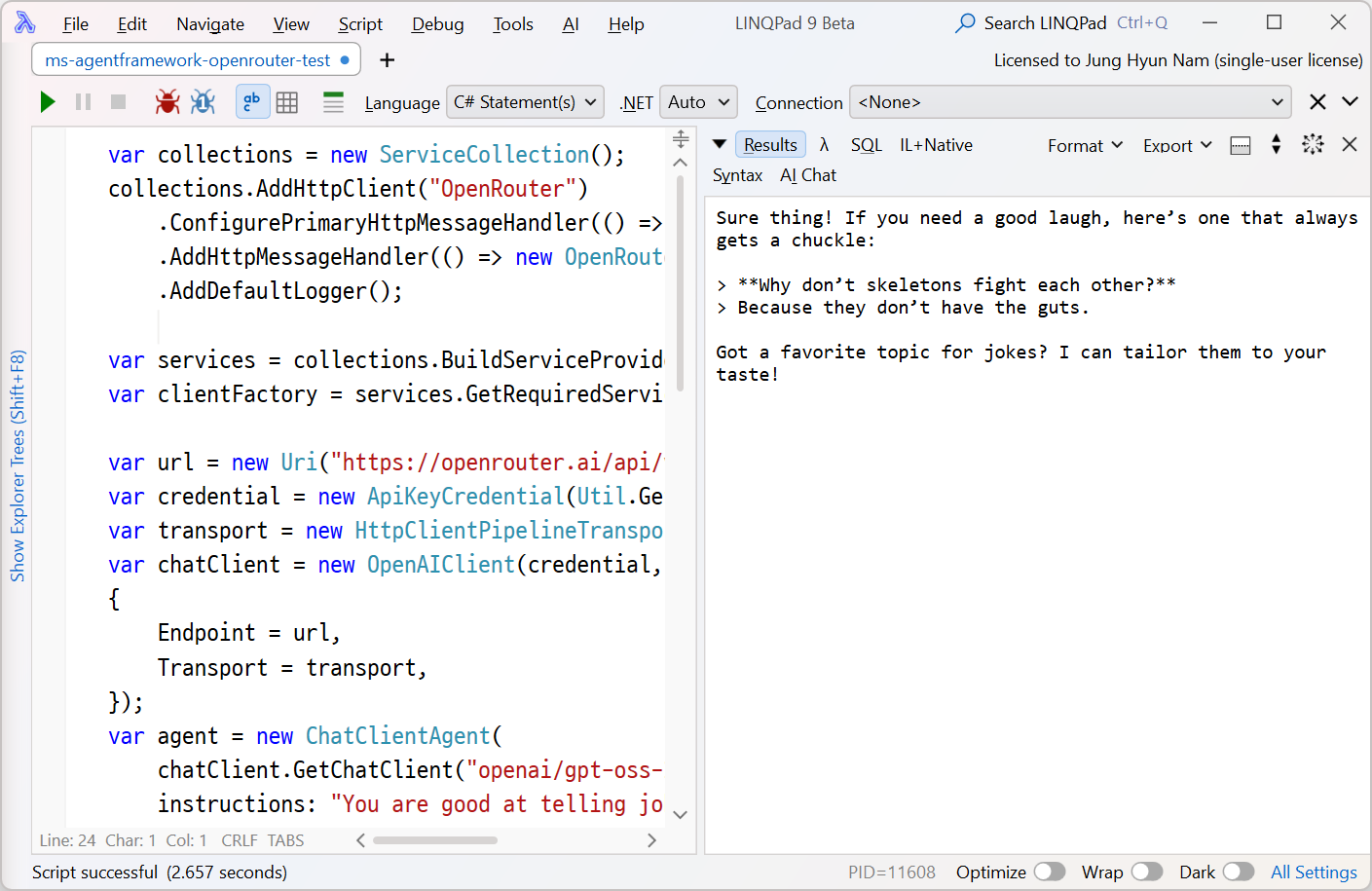 위의 코드는 Microsoft.Agents.AI (Preview), Microsoft.Extensions.AI.OpenAI (Preview), Microsoft.Extensions.DependencyInjection, Microsoft.Extensions.Http 4개의 nuget 패키지가 필요합니다.