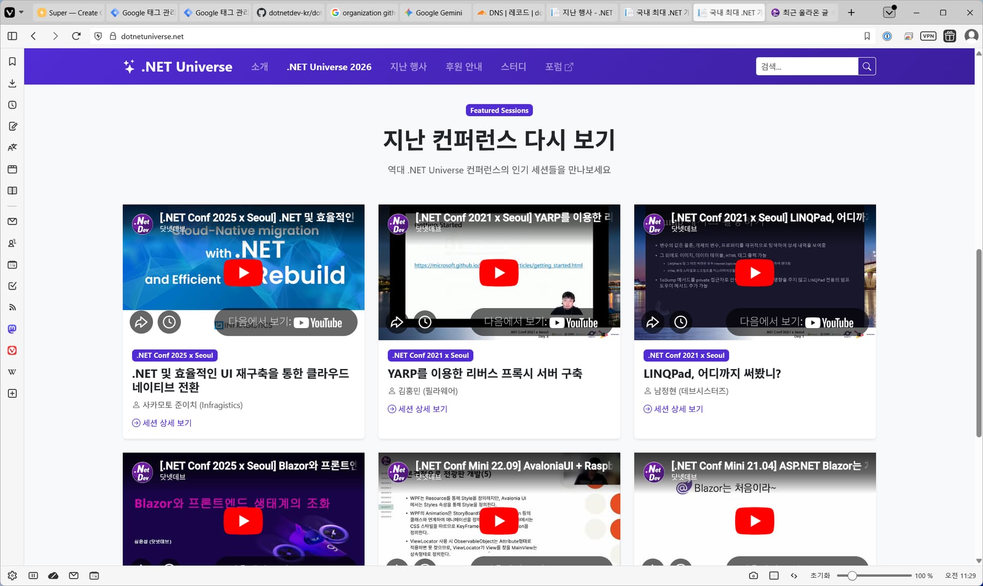 이전의 Notion 기반 웹 사이트에서는 과거 컨퍼런스 영상과 자료들을 찾아보기 어렵다는 한계가 있었습니다만, 이제 닷넷 유니버스 홈페이지에 오시면 검색을 통해 그동안 닷넷콘 서울과 닷넷 유니버스 명의로 진행된 모든 과거 이벤트 자료와 영상을 다시 볼 수 있는 서비스가 제공됩니다.