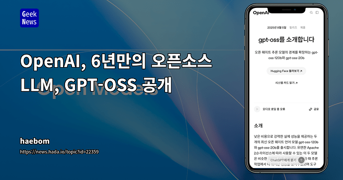 이번에 새로 공개된 오픈소스 LLM 모델 2종은 gpt-oss-120b와 gpt-oss-20b이며, 각각 o4-mini, o3-mini 수준의 성능을 보여준다고 되어있습니다.