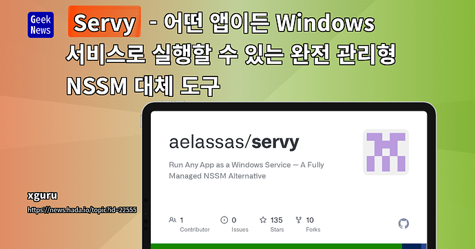Servy - 어떤 앱이든 Windows 서비스로 실행할 수 있는 완전 관리형 NSSM 대 | GeekNews