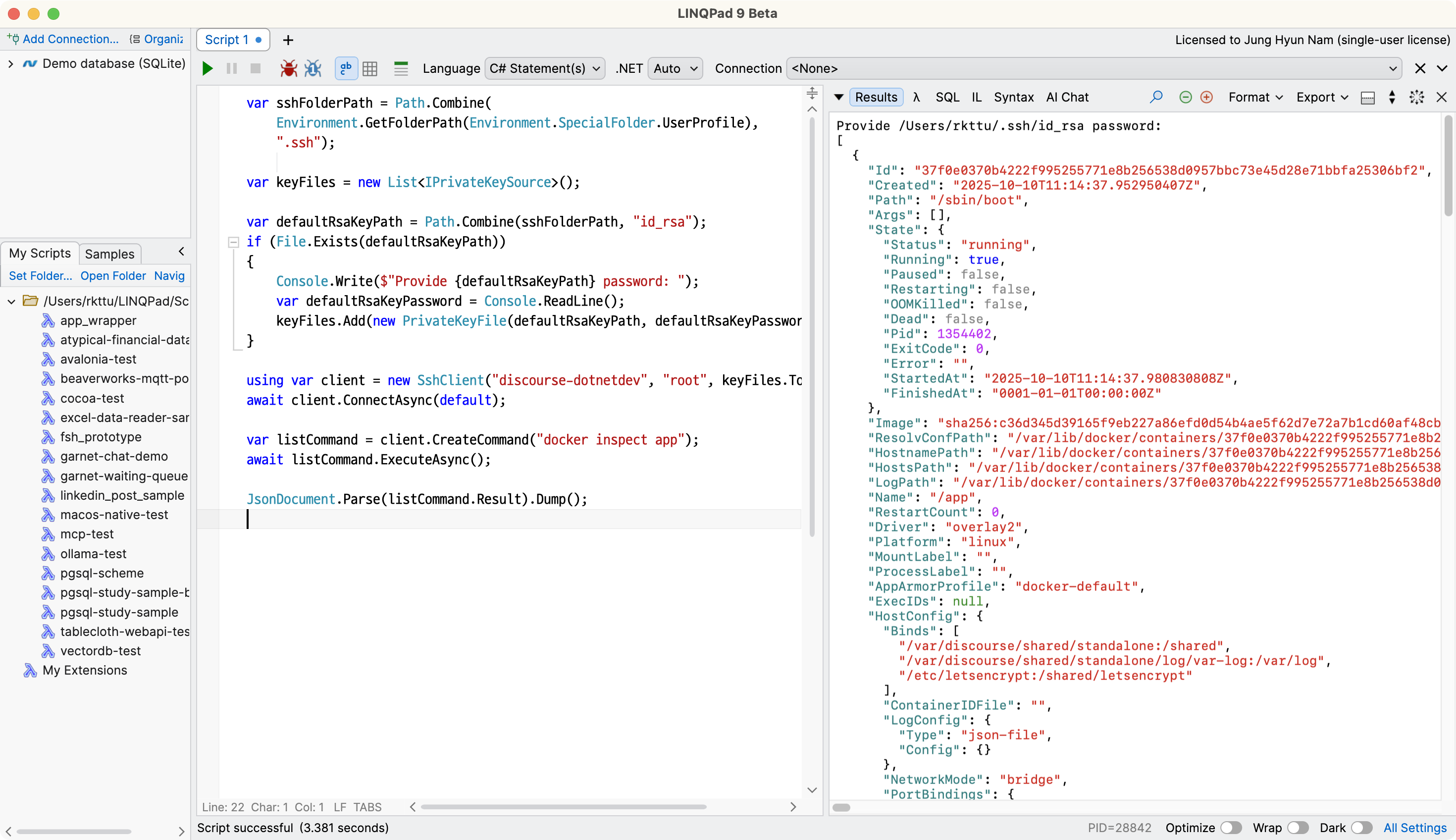위의 코드는 app 컨테이너의 상세 정보를 docker inspect 명령으로 조회하는 것으로, docker inspect의 출력 자체가 JSON으로 들어오기 때문에 이것을 곧바로 System.Text.Json의 JsonDocument로 받을 수 있다는 것입니다.