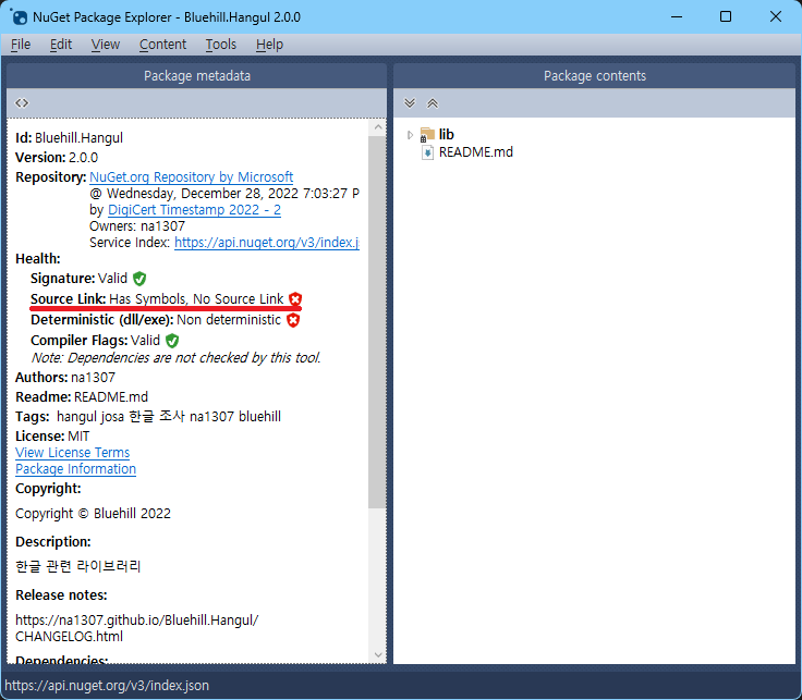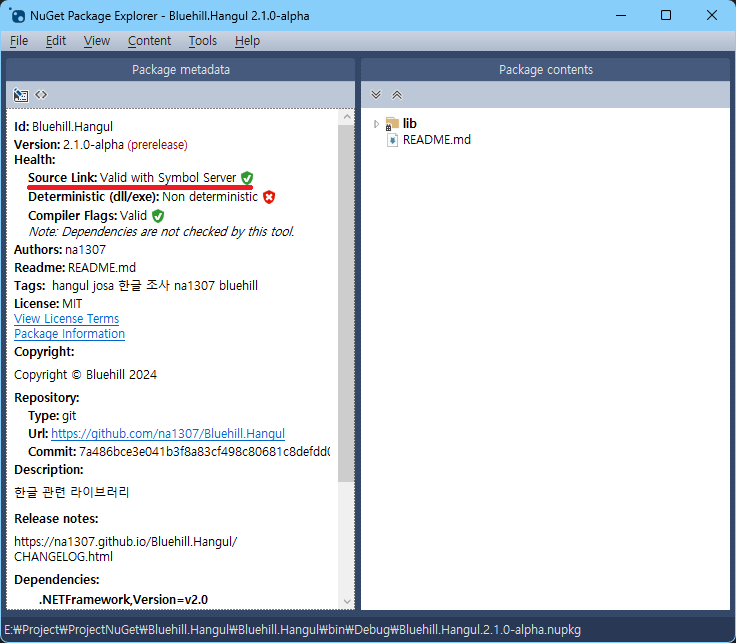 참고로 SourceLink의 경우 기본적으로 obj 폴더의 파일은 포함시키지 않아서 노란색 느낌표 방패가 뜹니다. 위 사진처럼 초록색 방패를 뜨게 하고 싶다면