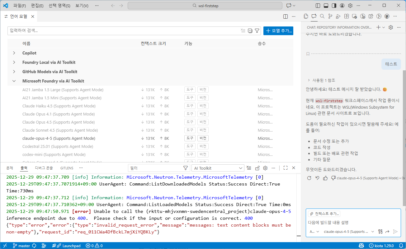 4. Ctrl/Cmd + Shift + P 키 → ‘채팅: 언어 모델 관리’ 실행 후 하단에 Microsoft Foundry via AI Toolkit에 항목이 나타날 때까지 잠시 기다림
