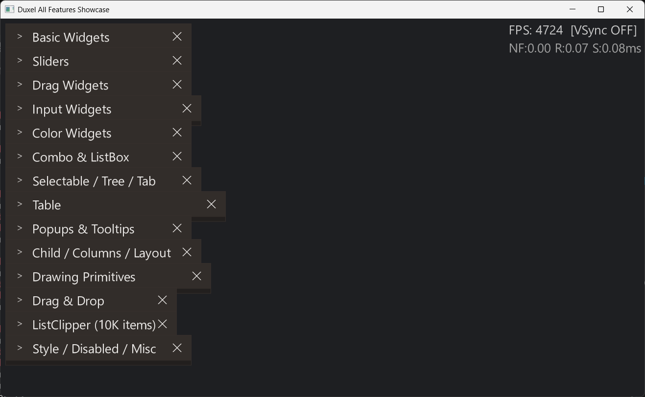 Duxel은 Dear ImGui와 유사한 즉시 렌더링 모델을 GPT-5.2-Codex를 이용해 .NET 10용으로 구현했습니다. GUI를 구성하는 별도의 논리적 트리가 없으므로 구조가 단순하며, GPU를 활용해 화면을 빠르게 다시 렌더링하는 데 집중합니다.