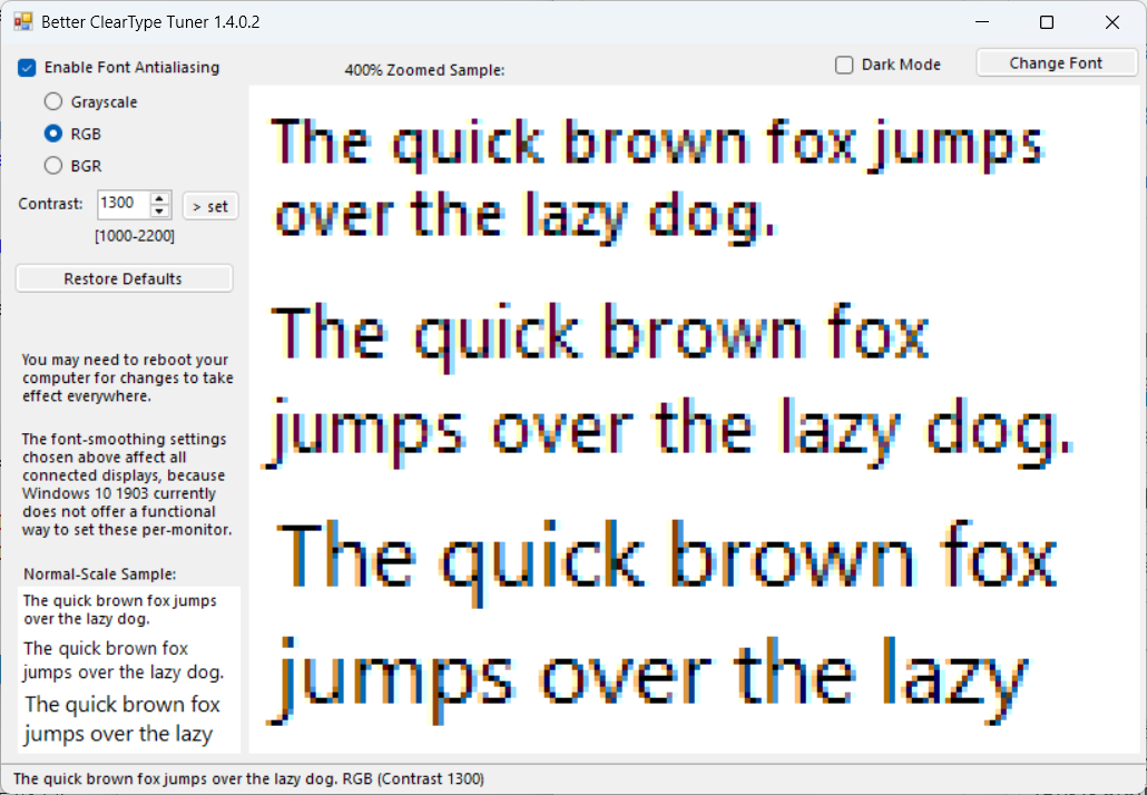 기본 Windows 내장 ClearType 튜너는 명확한 숫자값을 통한 튜닝을 제공하지 않기에, 실행해봐도 정말 의미있게 개선이 되는 것인지 확실히 알 수 없다는 점이 아쉬웠습니다. 그러다가 Better ClearType Tuner라는 .NET 기반의 오픈 소스 애플리케이션을 찾아서 적용해봤는데 흡족한 결과를 얻을 수 있었습니다.