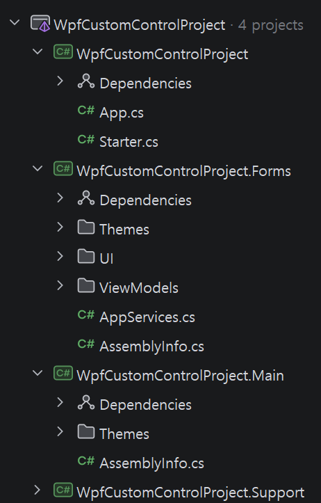 다음과 같이 루트 프로젝트, Forms, Main, Support프로젝트가 한번에 만들어집니다.